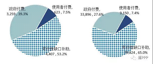 管理庫累計(jì)使用者付費(fèi)類項(xiàng)目623個(gè)、投資額9,150億元,分別占管理庫的7.5%和7.4%;累計(jì)可行性缺口補(bǔ)助(即政府市場(chǎng)混合付費(fèi))類項(xiàng)目4,407個(gè)、投資額8.0萬億元,分別占管理庫的53.2%和65.0%;累計(jì)政府付費(fèi)類項(xiàng)目3,259個(gè)、投資額3.4萬億元,分別占管理庫的39.3%和27.6%,具體如圖1-11-3和1-11-4。