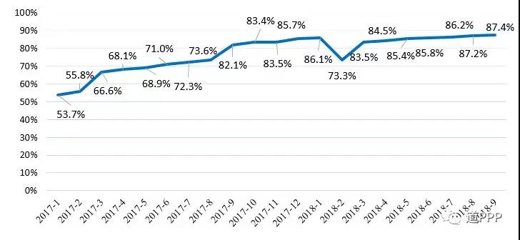 三季度落地示范項(xiàng)目?jī)魷p項(xiàng)目1個(gè)、投資額946億元,項(xiàng)目數(shù)、投資額下滑緣于落地示范項(xiàng)目退庫。截至2018年三季度,落地示范項(xiàng)目累計(jì)865個(gè)、投資額1.9萬億元,落地率87.4%,無移交階段項(xiàng)目。示范項(xiàng)目總體落地率變化如圖2-2-1。