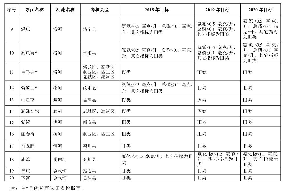 3. 2020 年度目標 全市氮氧化物減排 30220 噸,二氧化硫減排 27880 噸。全市 PM 2.5 (細顆粒物)年均濃度達到 54 微克/立方米以下,PM 10 (可吸入顆粒物)年均濃度達到 95 微克/立方米以下,城市區(qū)優(yōu)良天數(shù)達到 260 天以上。偃師市、孟津縣、新安縣、伊川縣、宜陽縣、吉利區(qū) PM 2.5 年均濃度達到 45 微克/立方米以下,汝陽縣、洛寧縣、欒川縣、嵩縣 PM 2.5 年均濃度達到 35 微克/立方米以下。全市地表水國、省重點監(jiān)控的 7 個斷面達到或優(yōu)于Ⅲ類水質(zhì)斷面比例保持 100%,其中伊河潭頭、洛河長水、汝河紫羅山斷面水質(zhì)保持或優(yōu)于Ⅱ類;市重點監(jiān)控斷面達到或優(yōu)于Ⅲ類水質(zhì)斷面比例達到 100%,其中伊河鳴皋斷面水質(zhì)達到或優(yōu)于Ⅱ類;全市縣級以上城市集中式飲用水水源地取水水質(zhì)達標率達到 100%;全面消除縣城建成區(qū)黑臭水體,基本消除農(nóng)村地區(qū)黑臭水體、坑塘;地下水質(zhì)量考核點位水質(zhì)級別保持穩(wěn)定。