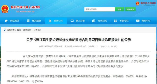 2018年10月30日,福州市連江經(jīng)濟(jì)開發(fā)區(qū)管委會公示《連江縣生活垃圾焚燒發(fā)電爐渣綜合利用項(xiàng)目選址論證報(bào)告》。