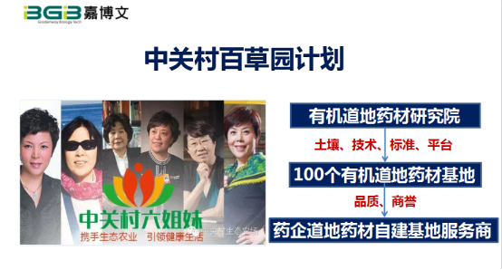 接下來(lái),講一下中關(guān)村百草園的案例。在國(guó)際中藥材市場(chǎng),中國(guó)的中藥占有率不到0.2%,日、韓是85%,他們?cè)趪?guó)際市場(chǎng)的中藥多是在中國(guó)種植的,但標(biāo)準(zhǔn)不一樣,關(guān)鍵就是高碳低氮健康土壤的培育。于是,我們?cè)谥嘘P(guān)村發(fā)起了一個(gè)百草園計(jì)劃,成立了有機(jī)道地藥材研究院,用中醫(yī)思想解決中藥問(wèn)題,其中最主要的就是有機(jī)質(zhì)安全、高效、標(biāo)準(zhǔn)化利用,標(biāo)準(zhǔn)化農(nóng)時(shí)管理。我們和北師大北中醫(yī)國(guó)家大學(xué)科技園等機(jī)構(gòu)共同成立這個(gè)研究院,作為一個(gè)平臺(tái),這也是中關(guān)村六姐妹們共同為有機(jī)中藥做的一個(gè)平臺(tái),建立100個(gè)有機(jī)道地藥材研究基地,它的第一個(gè)服務(wù)對(duì)象是中關(guān)村的生物制藥企業(yè),我們將在國(guó)家貧困縣做100個(gè)有機(jī)道地藥材項(xiàng)目,成為藥企自有藥材基地的運(yùn)營(yíng)服務(wù)商。