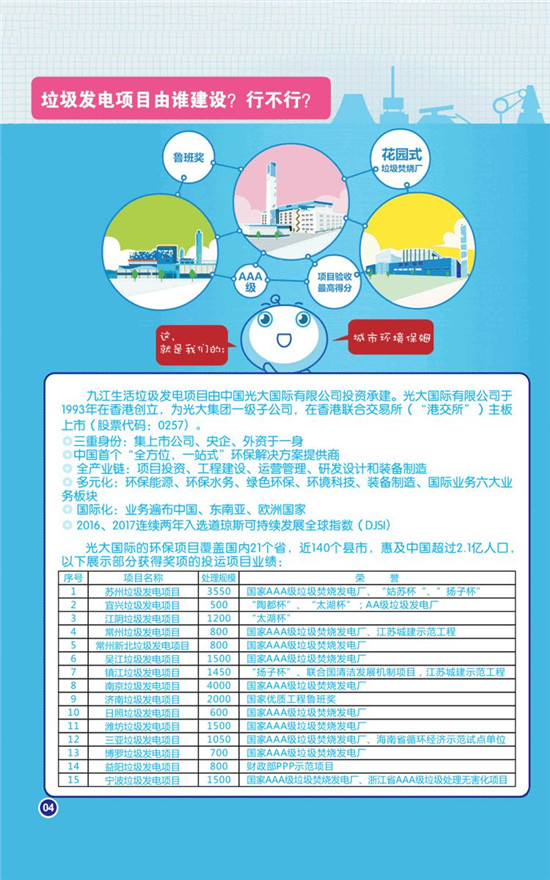 同杭州九峰垃圾焚燒發(fā)電項目一樣,九江垃圾焚燒發(fā)電項目也將由中國光大國際有限公司投資、建設(shè)、運營。據(jù)了解,光大國際在全國各地先后投資、建設(shè)、運營99個項目,日處理生活垃圾規(guī)模超過8萬噸,成為國內(nèi)垃圾焚燒發(fā)電行業(yè)領(lǐng)頭羊。光大國際所投資建設(shè)的垃圾發(fā)電項目均采用機械爐排爐工藝,煙氣排放執(zhí)行最為嚴(yán)格的歐盟2010標(biāo)準(zhǔn),煙氣監(jiān)測系統(tǒng)與當(dāng)?shù)丨h(huán)保部門在線聯(lián)網(wǎng),各種排放指標(biāo)向社會及時公布。垃圾滲濾液的綜合處理開創(chuàng)了國內(nèi)“先河”,以一個個環(huán)境優(yōu)美的花園式垃圾焚燒發(fā)電項目,向社會、居民、各地政府鄭重兌現(xiàn)了承諾。