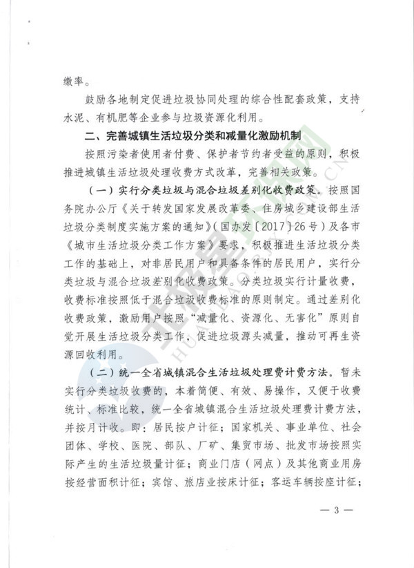 在積極推進生活垃圾分類工作的基礎(chǔ)上,對非居民用戶和具備條件的居民用戶,實行分類垃圾與混合垃圾差別化收費政策。分類垃圾實行計量收費,收費標準按照低于混合垃圾收費標準的原則制定。通過差別化收費政策,激勵用戶按照“減量化、資源化、無害化”原則自覺開展生活垃圾分類工作,促進垃圾源頭減量,推動可再生資源回收利用。暫未實行分類垃圾收費的,統(tǒng)一全省城鎮(zhèn)混合生活垃圾處理費計費方法,并按月征收。即:居民按戶計征;國家機關(guān)、事業(yè)單位、社會團體、學校、醫(yī)院、部隊、廠礦、集貿(mào)市場、批發(fā)市場按照實際產(chǎn)生的生活垃圾量計征;商業(yè)門店(網(wǎng)點)及其他商業(yè)用房按經(jīng)營面積計征;賓館、旅店業(yè)按床計征;客運車輛按座計征;餐廚垃圾按照實際產(chǎn)生量計征;其他產(chǎn)生生活垃圾的單位和個人按照定額或計量的方式計征。