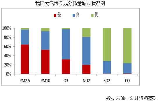 我國大氣污染源主要集中于工業(yè)污染和汽車尾氣,根據(jù)環(huán)境部發(fā)布的《2017年中國環(huán)境狀況公報》,我國338個城市中大氣的主要污染物集中在PM2.5、PM10、臭氧和氮氧化物。其中較為嚴(yán)重的是PM2.5和PM10。在統(tǒng)計的338個城市里,這兩項指標(biāo)差的城市比例高達(dá)50%以上。改善空氣質(zhì)量要從上述4種物質(zhì)的排放源下手。