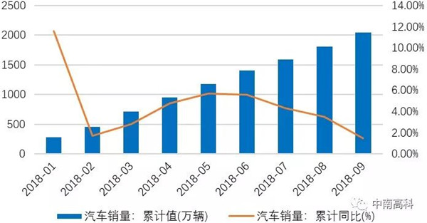 圖2:2018年汽車(chē)月累計(jì)銷(xiāo)量及累計(jì)同比增速