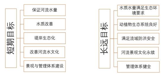 短期目標,一般以某條河流目前需要解決的主要面臨的問題為主要目標,但必須與長遠目標相銜接,兩者統籌考慮,分段實施,短期目標內容因依不同城市河流及其存在的主要問題來設置。