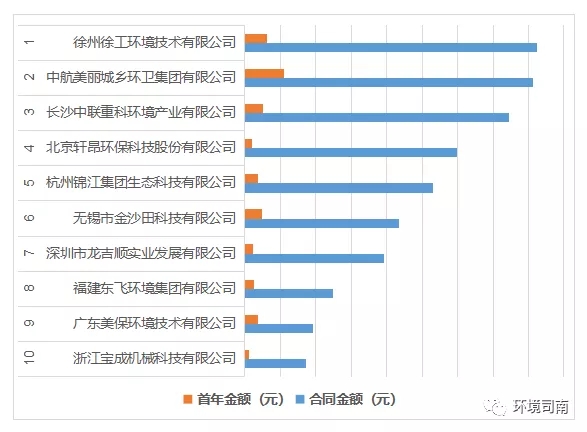 其中:“徐州徐工環(huán)境技術(shù)有限公司、中航美麗城鄉(xiāng)環(huán)衛(wèi)集團(tuán)有限公司、長沙中聯(lián)重科環(huán)境產(chǎn)業(yè)有限公司、杭州錦江集團(tuán)生態(tài)科技有限公司、深圳市龍吉順實(shí)業(yè)發(fā)展有限公司”等10家公司共中標(biāo)17個項(xiàng)目,合同總金額49.53億元,中標(biāo)項(xiàng)目首年服務(wù)費(fèi)總金額4.34億元。