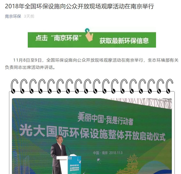 2017年7月,根據(jù)環(huán)保部、住建部《關(guān)于推進(jìn)環(huán)保設(shè)施和城市污水垃圾處理設(shè)施向公眾開(kāi)放的指導(dǎo)意見(jiàn)》精神,江蘇省環(huán)保廳聯(lián)合省住建廳啟動(dòng)環(huán)保設(shè)施向公眾開(kāi)放工作,5家單位成為第一批全國(guó)環(huán)保設(shè)施向公眾開(kāi)放點(diǎn),分別是:江蘇省環(huán)境監(jiān)測(cè)中心、江蘇省南京環(huán)境監(jiān)測(cè)中心、南京鐵北污水處理廠、光大環(huán)保能源(南京)有限公司、南京凱燕電子有限公司;2018年11月,江蘇省生態(tài)環(huán)境廳和省住建廳又公布了全省40個(gè)開(kāi)放點(diǎn)名單,實(shí)現(xiàn)全省13個(gè)設(shè)區(qū)市全覆蓋。