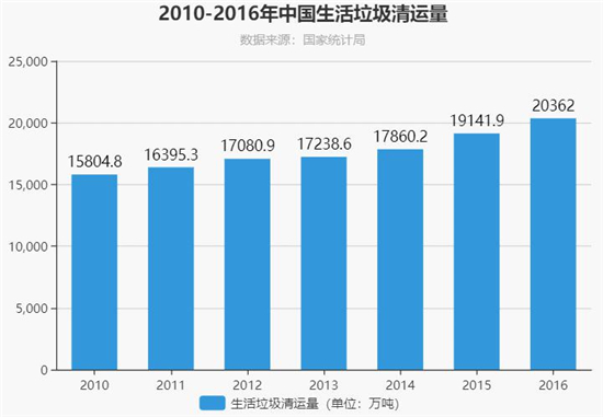 2010年到2016年的七年間,全國(guó)年垃圾清運(yùn)總量從15804.8萬(wàn)噸增長(zhǎng)到20362萬(wàn)噸,其中快遞貢獻(xiàn)了不少垃圾。