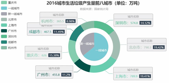 從下面的數(shù)據(jù)圖可以看出,生活垃圾產(chǎn)生量排位靠前的城市也都是經(jīng)濟(jì)發(fā)達(dá)、快遞業(yè)務(wù)繁榮的城市,全部為一線和新一線城市。其中一線城市所占比高達(dá)64.15%。