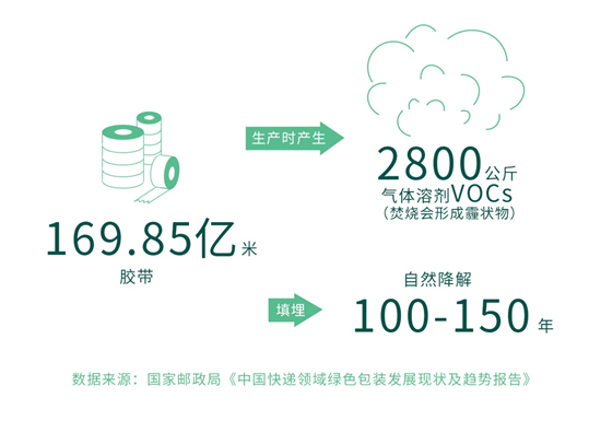 《中國(guó)快遞領(lǐng)域綠色包裝發(fā)展現(xiàn)狀及趨勢(shì)報(bào)告》顯示,2015 年 400 多萬(wàn)噸包裝垃圾中,消耗編織袋約 31 億條、塑料袋約 82.68 億個(gè)、封套約 31.05 億個(gè)、包裝箱約 99.22 億個(gè)、膠帶約 169.85 億米、內(nèi)部緩沖物約 29.77 億個(gè)。而這些膠帶在生產(chǎn)過(guò)程中,會(huì)產(chǎn)生 2800 公斤氣體溶劑 VOCs(焚燒會(huì)形成霾狀物),如果填埋處理,實(shí)現(xiàn)自然降解需要 100-150 年。