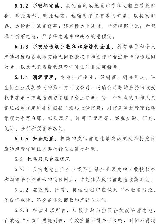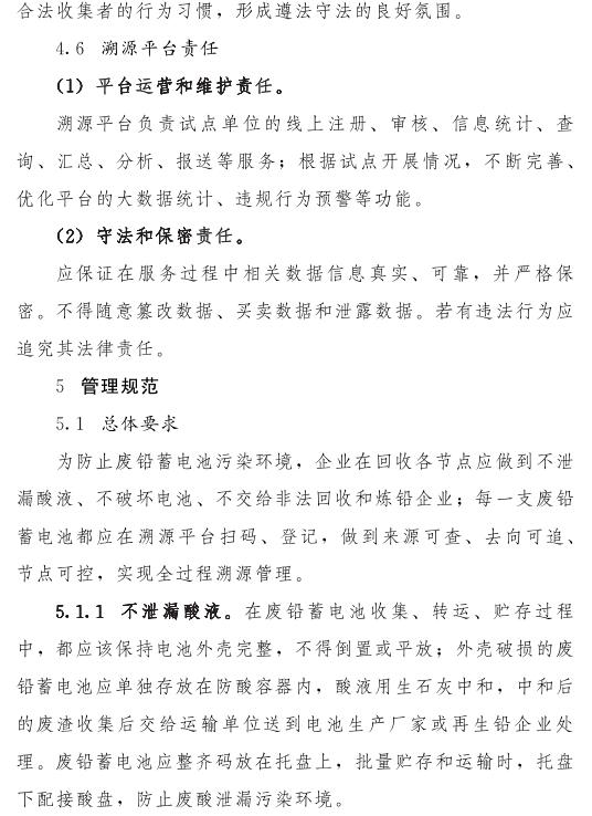 推動(dòng)落實(shí)生產(chǎn)者責(zé)任延伸制度,由鉛蓄電池生產(chǎn)企業(yè)依托自有銷售渠道建立廢鉛蓄電池逆向物流回收體系,持危險(xiǎn)廢物經(jīng)營(yíng)許可證的再生鉛企業(yè)可通過自主回收、聯(lián)合回收或委托回收等方式建立回收體系。鼓勵(lì)生產(chǎn)企業(yè)和持證企業(yè)進(jìn)行信息溝通和密切合作,以市場(chǎng)為導(dǎo)向,建立穩(wěn)定的商業(yè)交易模式,并采取以舊換新等措施,不斷提高收集處理率。各回收體系收集的廢鉛蓄電池最終須交由具有危險(xiǎn)廢物經(jīng)營(yíng)許可證的再生鉛企業(yè)利用處置。制定 《廢鉛蓄電池規(guī)范化管理指南》,明確回收體系中各環(huán)節(jié)、各責(zé)任主體責(zé)任及廢鉛蓄電池管理規(guī)范。參與廢鉛蓄電池回收的各責(zé)任主體須嚴(yán)格遵守 《廢鉛蓄電池規(guī)范化管理指南》的各項(xiàng)規(guī)定。