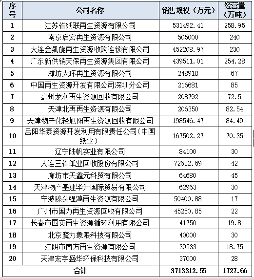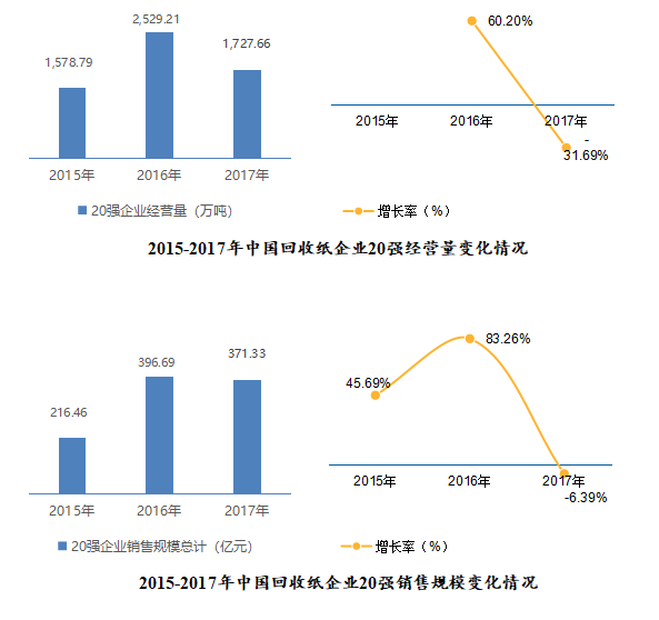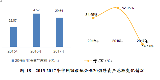 (一)2017年中國回收紙企業(yè)二十強的銷售規(guī)模371.33億元(2015年為216.46億元,2016年為396.69億元),較2016年同比降低了6.39%;經營總量1727.66萬噸,較2016年的2529.21萬噸減少了約800萬噸,下降31.6%;凈資產總額為29.64億元,較2016年的34.52億元同比降低了14.14%,較2015年的22.57億元也有所下降。造成這種現(xiàn)象的主要原因是:一是經營企業(yè)對于2017年的回收紙價格波動采取防御政策,減少了經營量;二是受國家環(huán)保政策不斷收緊、環(huán)保督察日趨嚴格、廢紙進口管控政策趨嚴等因素影響,部分回收紙打包廠被迫關閉,減少了廢紙回收量;三是與《2016中國回收紙行業(yè)發(fā)展報告》相比,部分企業(yè)未進行申報,對銷售規(guī)??偤彤a生一定影響。