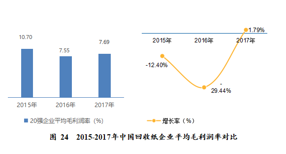 (二)2017年,中國回收紙二十強企業(yè)平均綜合毛利率為7.69%,較2016年的7.55%上升了0.14個百分點,同比增長1.79%;但仍低于2015年的10.70%,說明中國回收紙企業(yè)的競爭力和盈利能力與上一年基本持平,受行業(yè)整體發(fā)展趨勢影響,提升緩慢。