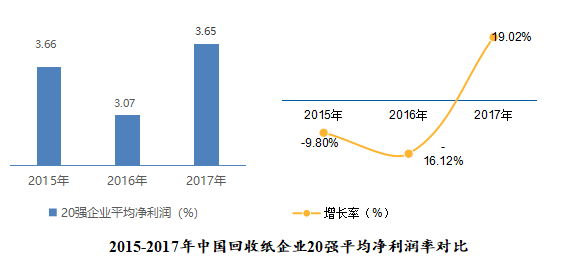 (三)2017年,中國回收紙二十強企業(yè)平均凈利率為3.65%,較2016年的3.07%上升了0.58個百分點,同比增長了19.02%,但是略低于2015年3.66%。結合前二十強企業(yè)整體經營情況,在2017年中國回收紙企業(yè)銷售收入總額降低的情況下,平均凈利率和平均綜合毛利率保持相對穩(wěn)定狀態(tài),說明總體企業(yè)盈利能力有所提升,反映出兩個行業(yè)發(fā)展趨向,一是回收紙企業(yè)發(fā)展的內生動力開始加強;二是行業(yè)整個生產體系的內需拉動開始復蘇。