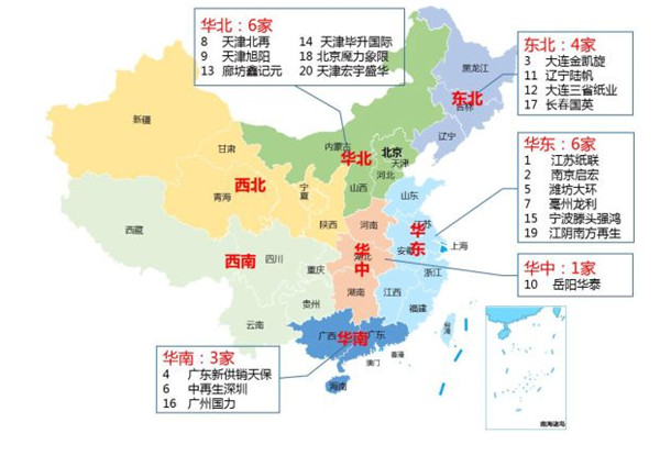 (一)從二十強企業(yè)的數(shù)量區(qū)域布局看,2017年中國回收紙二十強企業(yè)主要分布在華東和華北地區(qū),其中,華東、華北地區(qū)各有6家企業(yè)入圍前二十強,且華東沿海地區(qū)的企業(yè)在銷售收入指標排名都比較靠前;另外,東北地區(qū)4家,華南地區(qū)3家,華中地區(qū)1家。這種分布特點與經營量100噸/天以上單體回收紙打包廠分布趨勢相一致,說明前二十強企業(yè)均重視經營較大規(guī)模的回收紙打包廠,并由一定數(shù)量的大型回收紙打包廠作為業(yè)務支撐,由傳統(tǒng)回收向精細化方向發(fā)展,結構調整、優(yōu)化升級正在加快進行。