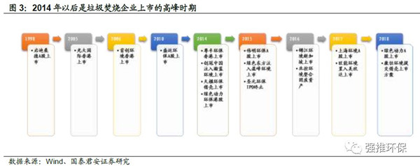 2014年及以后是我國垃圾焚燒企業(yè)上市的高峰時(shí)期。自1985年第一座垃圾焚燒廠在深圳建成,“十一五”期間垃圾焚燒行業(yè)開始發(fā)展,目前大部分項(xiàng)目是在2012年以后開始投運(yùn)。有了穩(wěn)定的運(yùn)營業(yè)績(jī),垃圾焚燒的龍頭開始上市,除了光大國際、首創(chuàng)、北控、桑德等綜合型環(huán)保集團(tuán),2017年垃圾焚燒產(chǎn)能前22名的公司有10家是在2014年后上市或準(zhǔn)備上市。