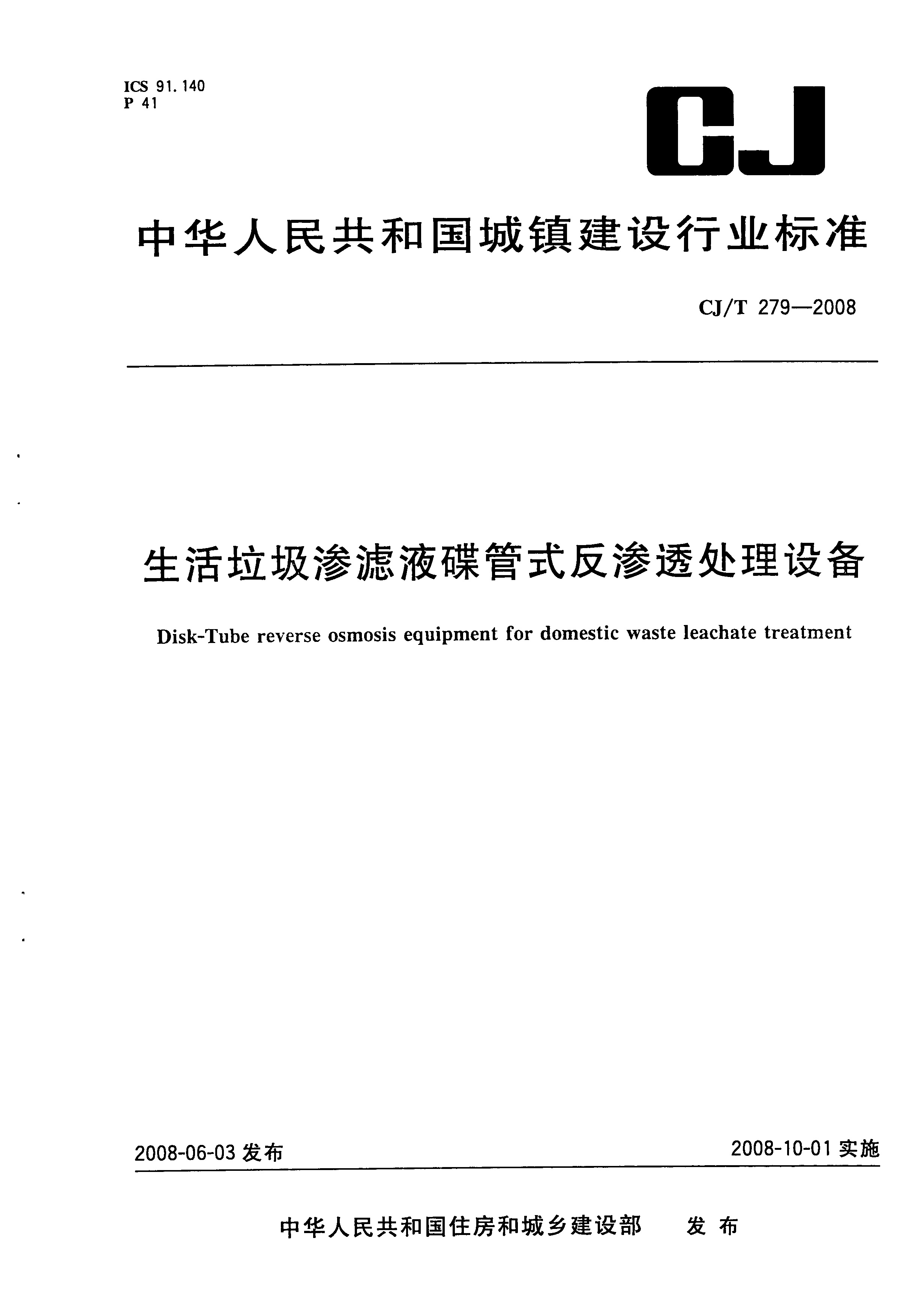 生活垃圾滲濾液碟管式反滲透處理設(shè)備(CJ/T 279-2008)