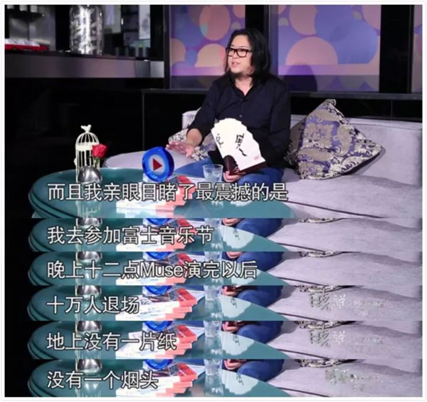 矮大緊老師曾在節(jié)目中提到過(guò),自己去東京參加富士音樂(lè)節(jié),活動(dòng)結(jié)束時(shí)讓他感到非常震撼,十萬(wàn)人退場(chǎng)地上竟然沒(méi)有一點(diǎn)垃圾。更還有一些標(biāo)榜自己“個(gè)性十足”的粉絲在午夜排起長(zhǎng)隊(duì)等候扔垃圾。