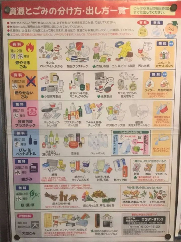 垃圾分類(lèi)的大方向是以下幾類(lèi):可燃垃圾,不可燃垃圾,舊紙類(lèi),玻璃瓶,罐,塑料瓶,這個(gè)基本上全日本沒(méi)什么太大的差別。