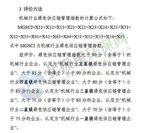 11月23日《機械行業(yè)綠色供應鏈管理企業(yè)評價指標體系》、《汽車行業(yè)綠色供應鏈管理企業(yè)評價指標體系》及《電器電子行業(yè)綠色供應鏈管理企業(yè)評價指標體系》公示征求意見,具體內(nèi)容如下: