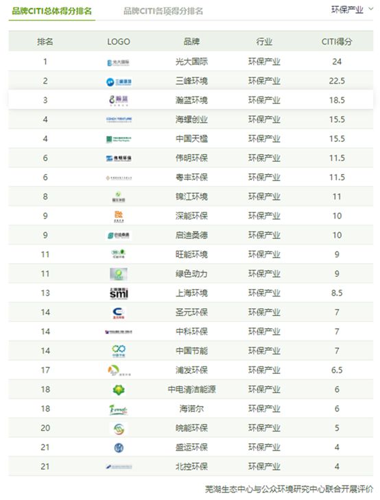 在本期CITI指數(shù)排行榜中,環(huán)保產(chǎn)業(yè)品牌占22個,榮登環(huán)保產(chǎn)業(yè)CITI指數(shù)排名前三甲的是光大國際、三峰環(huán)境和瀚藍環(huán)境。