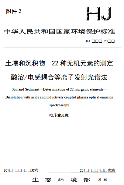 為貫徹《中華人民共和國(guó)環(huán)境保護(hù)法》,保護(hù)與控制質(zhì)量,保障人體健康,規(guī)范土壤沉積物中無(wú)機(jī)元素的測(cè)定方法,印發(fā)《土壤和沉積物 22種無(wú)機(jī)元素的測(cè)定 酸溶/電感耦合等離子發(fā)射光譜法(征求意見(jiàn)稿)》,詳情如下: