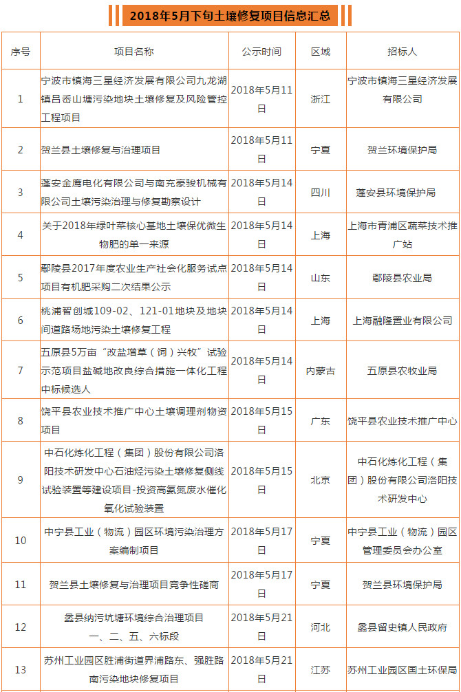 我國市場前景廣闊,很多也在如火如荼地進行,5月下旬又有哪些項目呢?來源:CSER土壤修復(fù)平臺