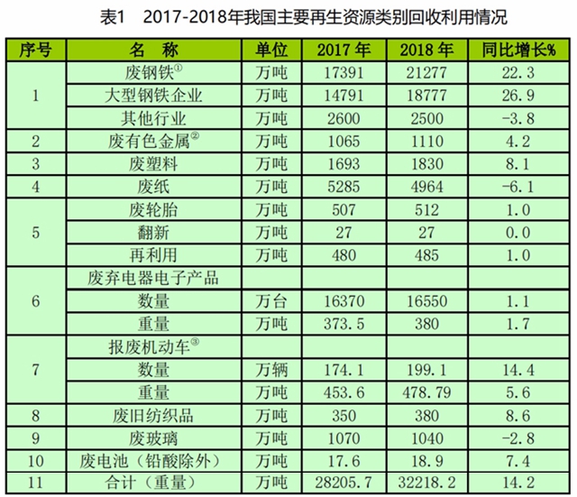 商務(wù)部流通業(yè)發(fā)展司發(fā)布了《中國再生資源回收行業(yè)發(fā)展報告(2019)》,其中詳述了行業(yè)發(fā)展基本狀況、行業(yè)發(fā)展特點及問題、各主要品種回收情況分析、行業(yè)發(fā)展環(huán)境及趨勢分析。 總結(jié):2018年,我國再生資源回收總量增長較快。 十大類別的再生資源回收總量為32218.2億噸,同比增長14.2%; 由此可見,廢...