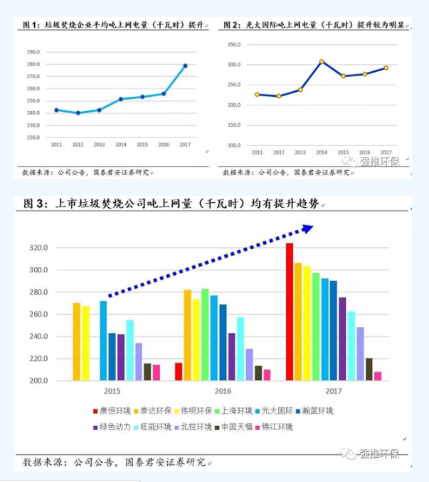 整理數(shù)據(jù)發(fā)現(xiàn),近年來垃圾焚燒企業(yè)噸垃圾上網(wǎng)電量出現(xiàn)較明顯的提升。 1)垃圾焚燒龍頭公司的噸垃圾上網(wǎng)電量均值在2011-2017七年間提升36千瓦時。按照全年上網(wǎng)電量/年入廠垃圾量作為計算指標(biāo),2017年龍頭公司平均噸上網(wǎng)電量均值為279千瓦時,較2011年時提升了15%,增加了36千瓦時。 2)20...