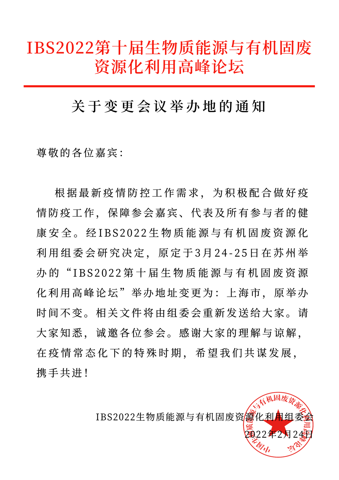 2月24日,IBS2022組委會發(fā)布通知,原定于3月24-25日在蘇州舉辦的“IBS2022第十屆生物質能源與有機固廢資源化利用高峰論壇”舉辦地址變更為上海市,時間不變。 3月14日,IBS2022組委會再次發(fā)布通知,原定于2022年3月24-25日在上海舉辦的“...