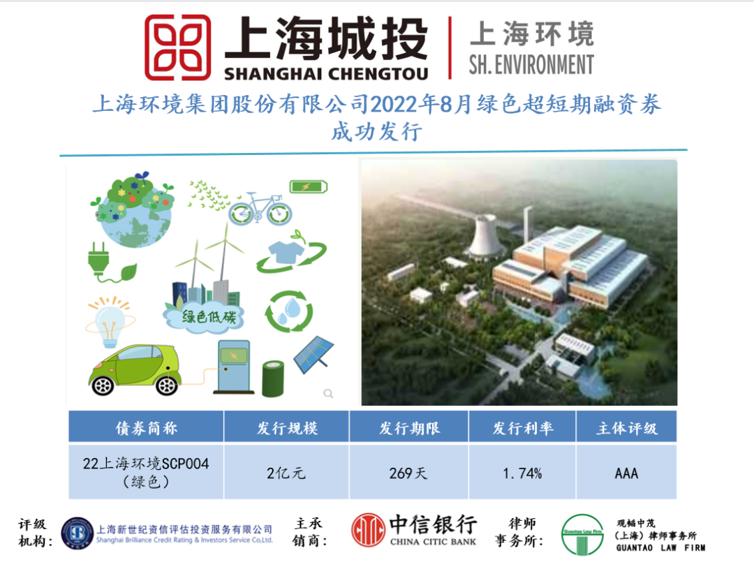文章導(dǎo)讀8月30日,上海環(huán)境集團(tuán)股份有限公司成功發(fā)行22上海環(huán)境SCP004(綠色),融資規(guī)模2億元,期限269天,用于滿足下屬子公司日常運(yùn)營的資金需求。本次發(fā)行綠色超短融最終票面利率為年化1.74%。上海環(huán)境通過積極響應(yīng)綠色金融活動(dòng),參與經(jīng)濟(jì)社會(huì)綠色低碳轉(zhuǎn)型,助力“碳達(dá)峰”、“碳中和”。2021年...