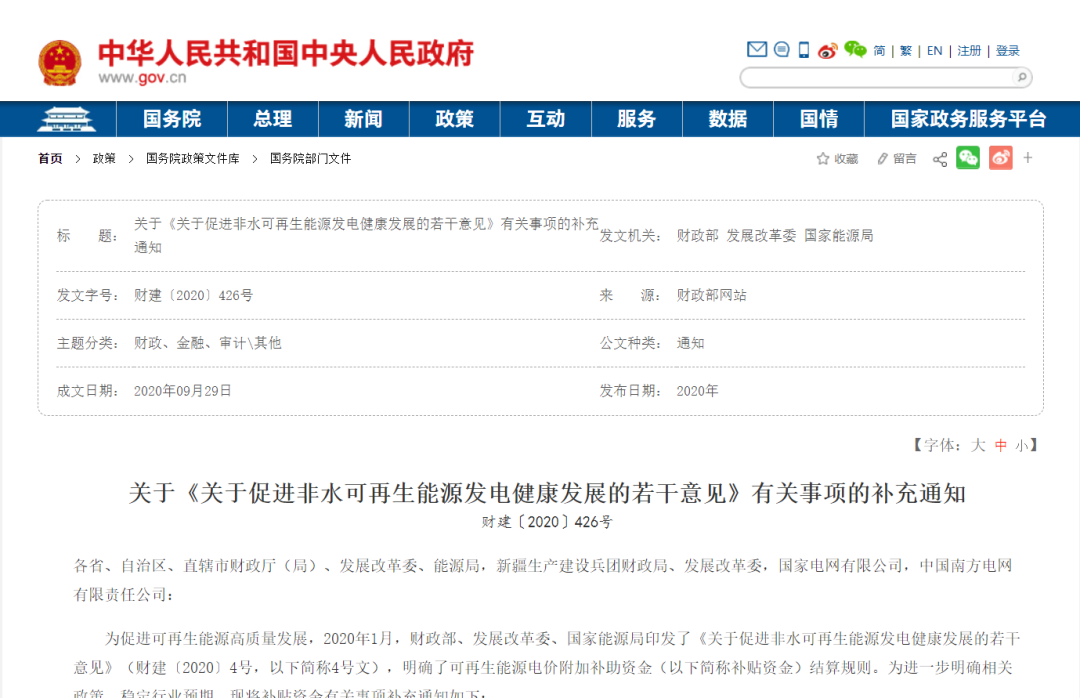 文章導(dǎo)讀為促進(jìn)可再生能源高質(zhì)量發(fā)展,2020年1月,財(cái)政部、發(fā)展改革委、國家能源局印發(fā)了《關(guān)于促進(jìn)非水可再生能源發(fā)電健康發(fā)展的若干意見》(財(cái)建〔2020〕4號(hào),以下簡稱4號(hào)文),明確了可再生能源電價(jià)附加補(bǔ)助資金(以下簡稱補(bǔ)貼資金)結(jié)算規(guī)則。為進(jìn)一步明確相關(guān)政策,穩(wěn)定行業(yè)預(yù)期,現(xiàn)將補(bǔ)貼資金有關(guān)事項(xiàng)補(bǔ)充...