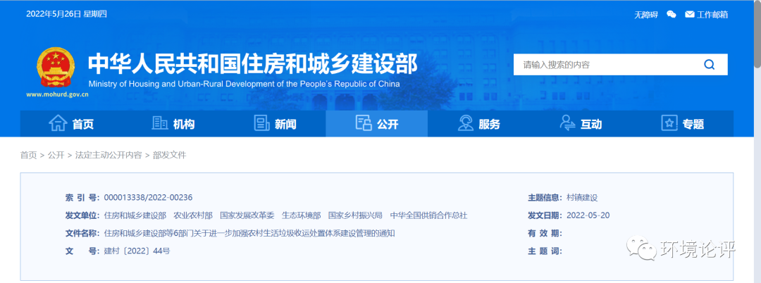 為深入貫徹黨中央、國務(wù)院關(guān)于實施鄉(xiāng)村建設(shè)行動的決策部署,落實《農(nóng)村人居環(huán)境整治提升五年行動方案(2021—2025年)》明確的目標(biāo)任務(wù),統(tǒng)籌縣鄉(xiāng)村三級生活垃圾收運(yùn)處置設(shè)施建設(shè)和服務(wù),進(jìn)一步擴(kuò)大農(nóng)村生活垃圾收運(yùn)處置體系覆蓋范圍,提升無害化處理水平,健全長效管護(hù)機(jī)制,近日,住房和城鄉(xiāng)建設(shè)部等6部門印發(fā)《...