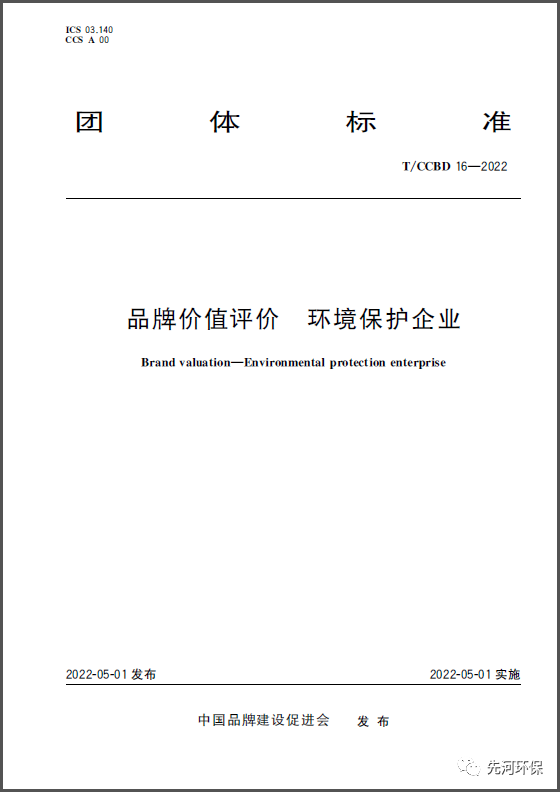 《品牌價值評價 環(huán)境保護企業(yè)》團體標準 T/CCBD16-2022正式發(fā)布實施! 2022年5月1日,在中國品牌建設(shè)促進會的指導下,由河北先河環(huán)??萍脊煞萦邢薰镜?5家企業(yè)共同參與并制定的《品牌價值評價 環(huán)境保護企業(yè)》團體標準T/CCBD 16-2022于2022年5月1日正式發(fā)布實施。 該標準基...