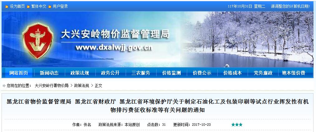 日前,省物價(jià)監(jiān)督管理局、黑龍江省財(cái)政廳、黑龍江省環(huán)境保護(hù)廳聯(lián)合印發(fā)關(guān)于制定石油化工及包裝印刷等試點(diǎn)行業(yè)排污費(fèi)征收標(biāo)準(zhǔn)等有關(guān)問題的通知。黑龍江省石油化工、包裝印刷等試點(diǎn)行業(yè)征收標(biāo)準(zhǔn)與二氧化硫、氮氧化物排污費(fèi)征收標(biāo)準(zhǔn)相同,即:每污染當(dāng)量1.2元。自2017年11月1日起執(zhí)行。全文如下:黑龍江省物價(jià)監(jiān)督管...