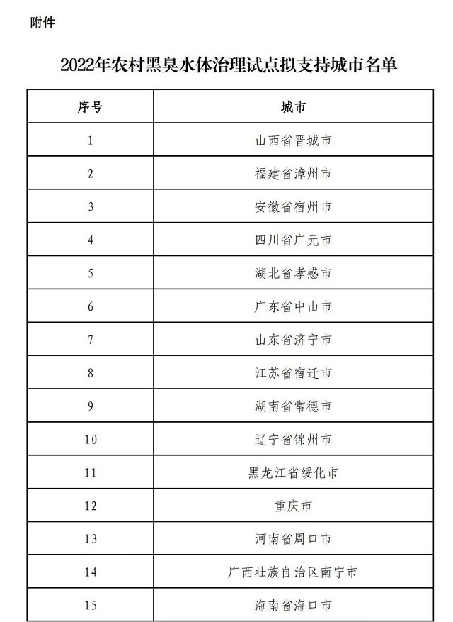 今年3月,財政部、生態(tài)環(huán)境部通知開展2022年農(nóng)村黑臭水體治理試點工作,6月10日,財政部對2022年農(nóng)村黑臭水體治理試點支持城市名單予以公示。文件擬將15個城市確定為2022年支持的農(nóng)村黑臭水體治理試點城市,包括山西晉城市、安徽宿州市、湖北孝感市、廣東中山市、重慶市等。 目前,該名單仍處于公示期內(nèi)...