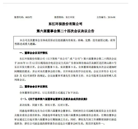 東江環(huán)保發(fā)布公告,于2018年11月12日舉行的第六屆董事會第24次會議,董事會選舉譚侃為第六屆董事會董事長,任期自董事會審議通過之日起至本屆董事會屆滿之日止。董事會選舉譚侃為第六屆董事會戰(zhàn)略發(fā)展委員會主席,選舉鄧謙為第六屆董事會戰(zhàn)略發(fā)展委員會委員,與曲久輝共同構(gòu)成第六屆董事會戰(zhàn)略發(fā)展委員會。董事會...