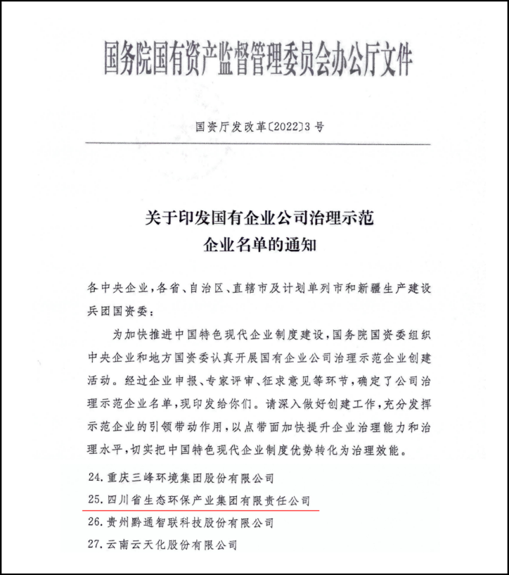 國(guó)企改革顯成效 公司治理見真章 四川生態(tài)環(huán)保集團(tuán)獲評(píng)國(guó)務(wù)院國(guó)資委“國(guó)有企業(yè)公司治理示范企業(yè)” 近日,國(guó)務(wù)院國(guó)資委正式發(fā)布“國(guó)有企業(yè)公司治理示范企業(yè)”名單,四川省生態(tài)環(huán)保產(chǎn)業(yè)集團(tuán)有限責(zé)任公司(以下簡(jiǎn)稱“四川生態(tài)環(huán)保集團(tuán)”)成功入選...