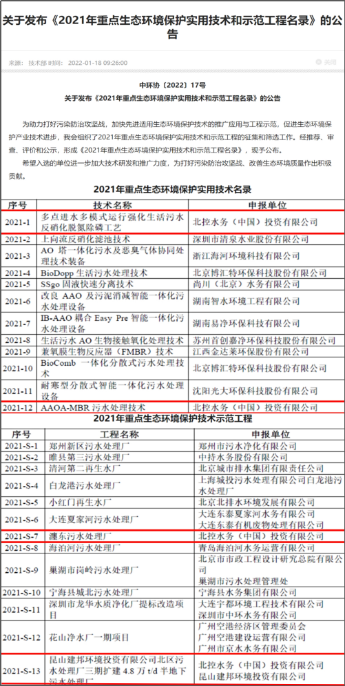 近日,中國環(huán)境保護產(chǎn)業(yè)協(xié)會公布了《2021年重點生態(tài)環(huán)境保護實用技術(shù)和示范工程名錄》, 北控水務(wù)申報的兩項技術(shù)、兩項工程成功上榜,分別入選“實用技術(shù)名錄”及“示范工程名錄”,彰顯了北控水務(wù)專業(yè)的技術(shù)能力和運營實力。 兩項實用技術(shù)上榜 技術(shù)專業(yè)創(chuàng)新能力獲...