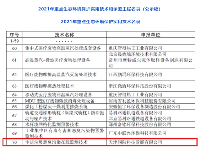 近日,中國環(huán)境保護(hù)產(chǎn)業(yè)協(xié)會(huì)公示了《2021年重點(diǎn)生態(tài)環(huán)境保護(hù)實(shí)用技術(shù)和示范工程名錄(公示稿)》,此次公示名錄共篩選出70項(xiàng)“2021年重點(diǎn)生態(tài)環(huán)境保護(hù)實(shí)用技術(shù)名錄”,65項(xiàng)“2021年重點(diǎn)生態(tài)環(huán)境保護(hù)技術(shù)示范工程”。其中天津同陽科技發(fā)展有限公司(以下簡...