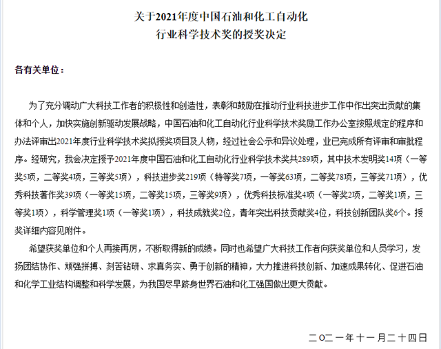 四方光電榮獲中國石油與化工自動化行業(yè)“科技進步一等獎”